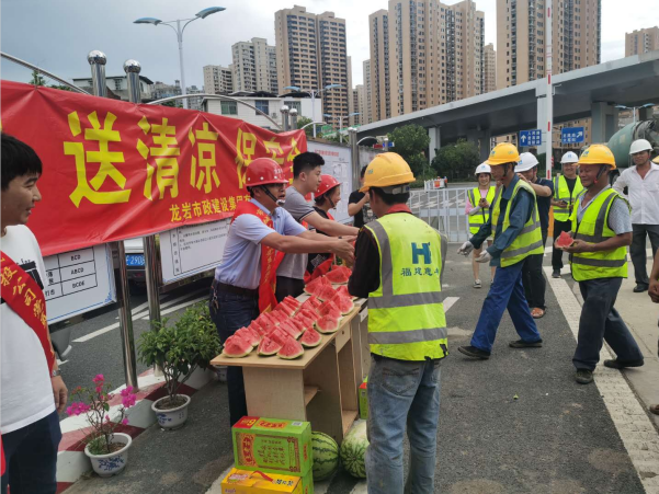 “弟兄們,來吃西瓜、喝涼茶”7月3日大中午,龍巖市政集團組織的黨員、志愿者們為午間在項目現場暫時休息的一線工人們獻上一塊塊甘甜可口西瓜。這是該公司針對近來天氣悶熱特意為一線職工開展的“走項目、送清涼、保安全”活動。班子成員兵分幾路分別帶隊前往龍巖大橋、浮東路、羅橋節點和龍巖大道二期等重點項目,為現場一線的工人們發放了西瓜、王老吉和菊花茶等防暑降溫食品,對廣大在一線的員工克服天氣影響,堅守崗位認真工作表示感謝!